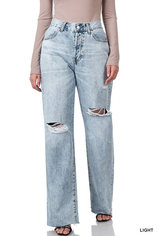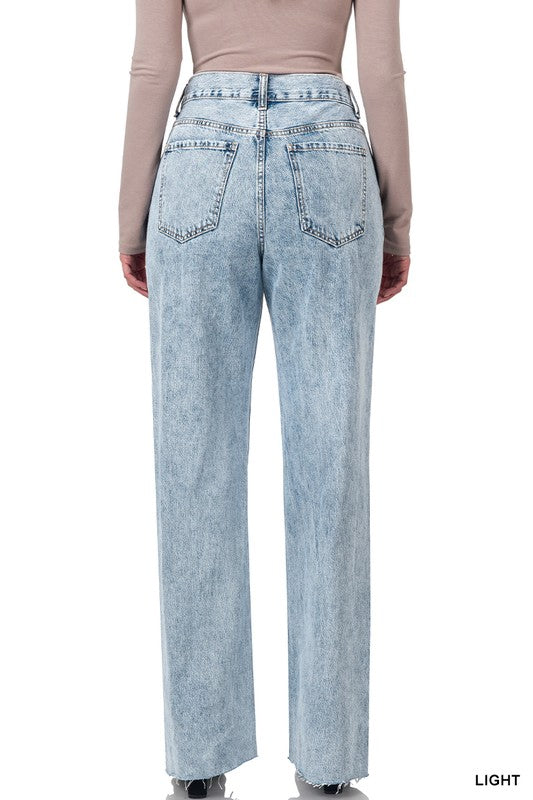Are high rise distressed straight leg denim jean Will definitely be your favorite! Big hugs and all the right places and features of straight leg denim style! Do keep in mind that these are 100% cotton and feature a non-stretch material. RAW HEM FRONT RISE: 11.75", INSEAM: 32.5" approx.