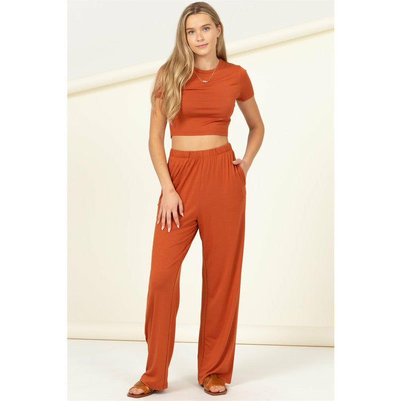 ends at a cropped hem. The set also includes high-waisted pants with a wide leg silhouette and two side pockets. Perfect chill fit.