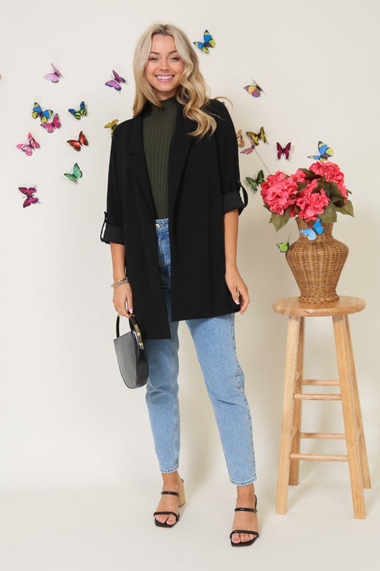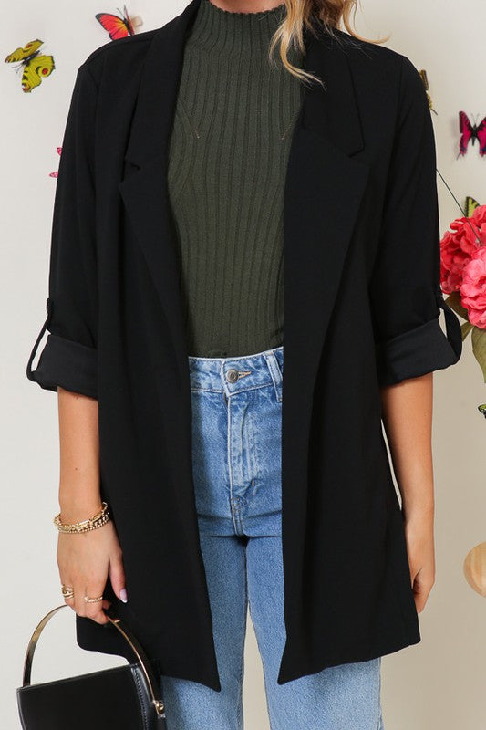 The perfect blazer with just the right amount of stretch. It features roll up sleeves and a open knit front with side slits and pockets.