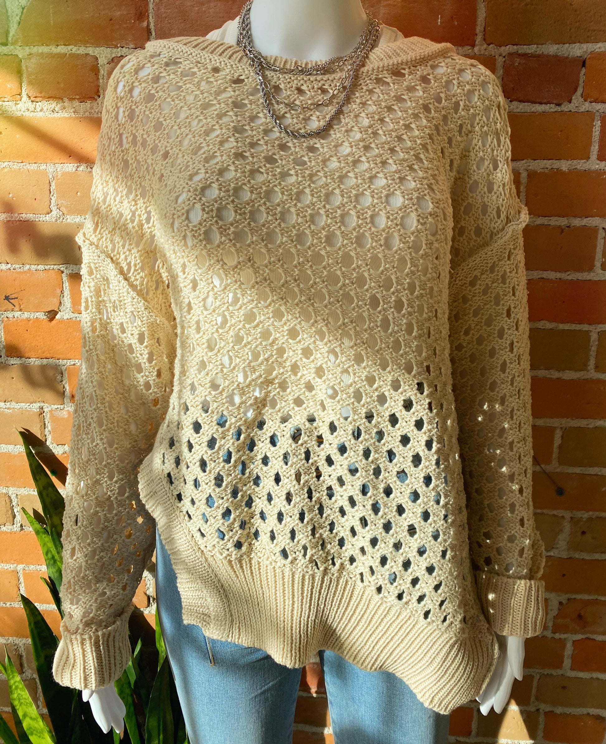 This stunning oversized sweater is perfect for those chilly days! Crafted from a beautiful cream material, it's an effortlessly stylish piece that adds an air of sophistication to your wardrobe. Wrap yourself in cozy warmth and enjoy the captivating open stitch design.