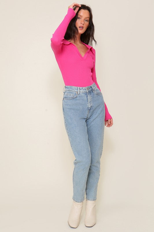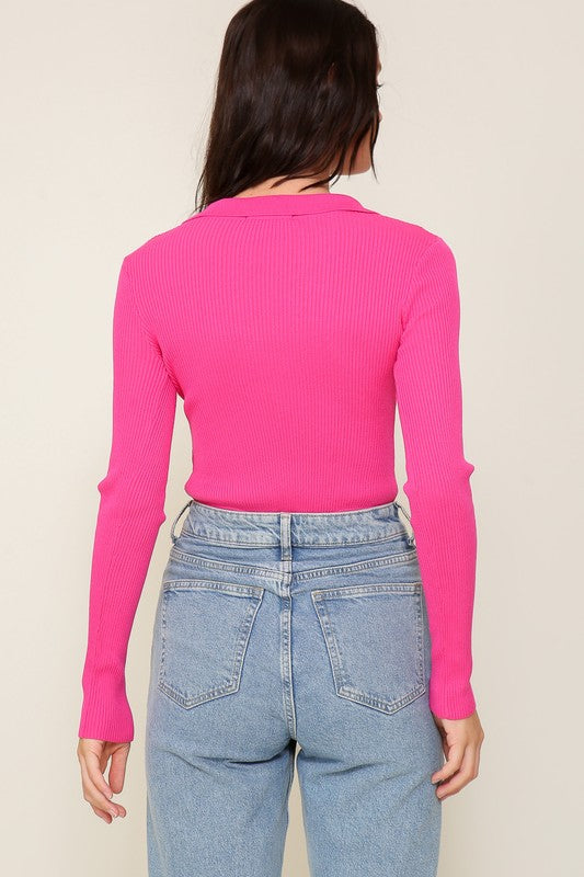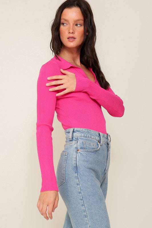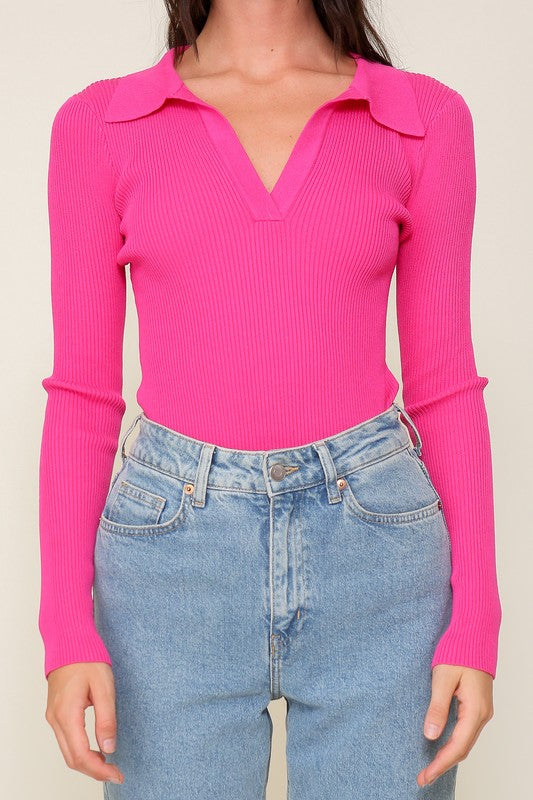 Experience a perfect blend of style and comfort with our Sweater Knit Bodysuit. Our velvety, ribbed knit fabric hugs your silhouette while the v-neck, collared design adds a touch of elegance. The delicate snap closure ensures a seamless fit. Prepare to turn heads with this sartorial masterpiece.