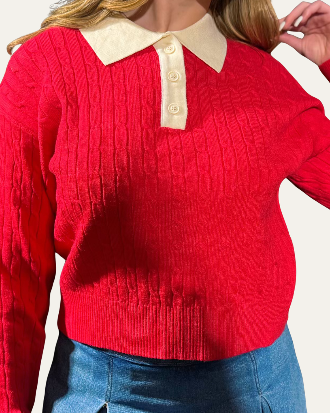 Add festive charm to your wardrobe with our Merry & Bright sweater! This super cute Peter pan collared sweater features a beautiful red color and cream collar with button detailing. Its cable knit pattern is both soft and warm, making it versatile for any occasion. Dress it up or down for a cozy and stylish look.