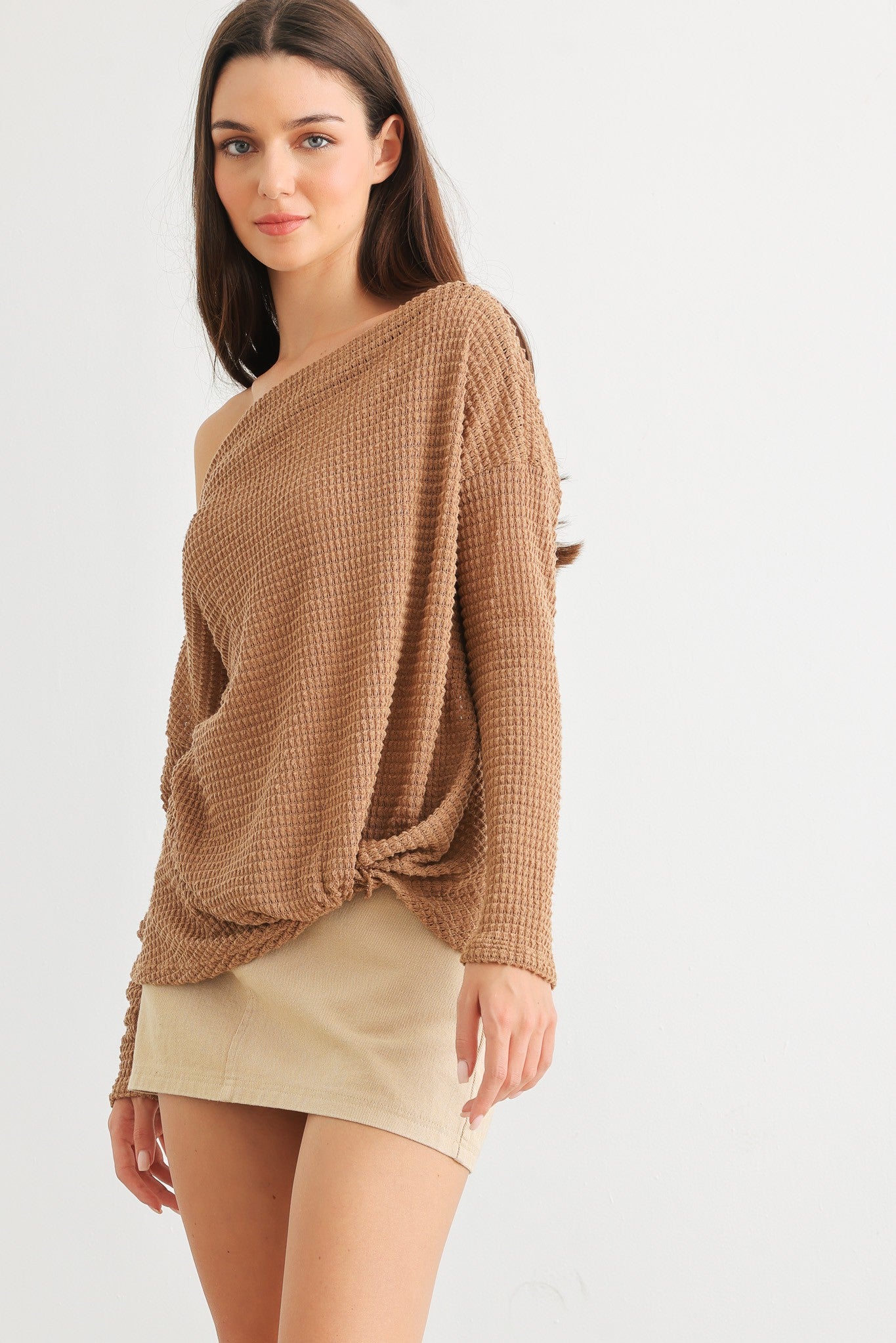 Waffle Knit Off-The-Shoulder Twist Hem Top